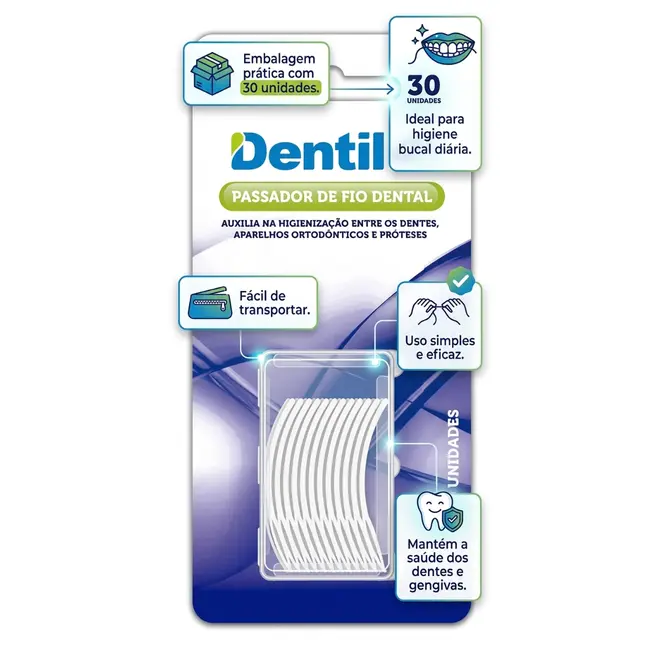 O passador de fio dental Dentil Pro foi desenvolvido para facilitar a higiene bucal, especialmente em casos de aparelhos ortodônticos, próteses ou pontes dentárias. Com design prático e material resistente, permite uma limpeza eficiente entre os dentes, ajudando a remover resíduos e placa bacteriana.