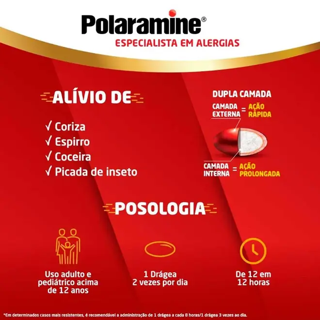 Polaramine é destinado para alergia, prurido, rinite alérgica, urticária, picada de inseto, conjuntivite alérgica, dermatite atópica (um tipo de inflamação na pele) e eczemas alérgicos (dermatite).