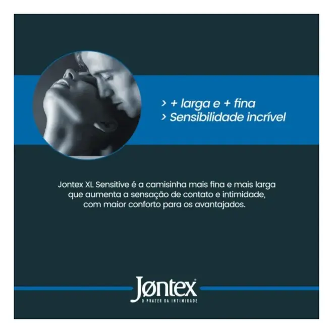 O Preservativo Jontex XL Sensitive foi desenvolvido para proporcionar maior conforto e segurança para quem necessita de um tamanho maior ("Mais Largo"). Sua estrutura é focada na sensibilidade, permitindo uma experiência mais natural sem abrir mão da proteção.
