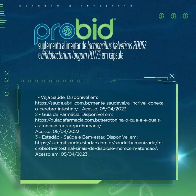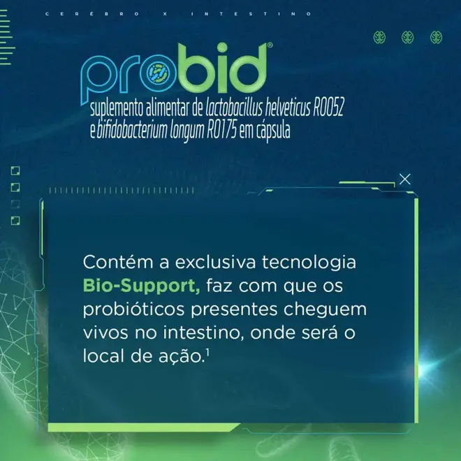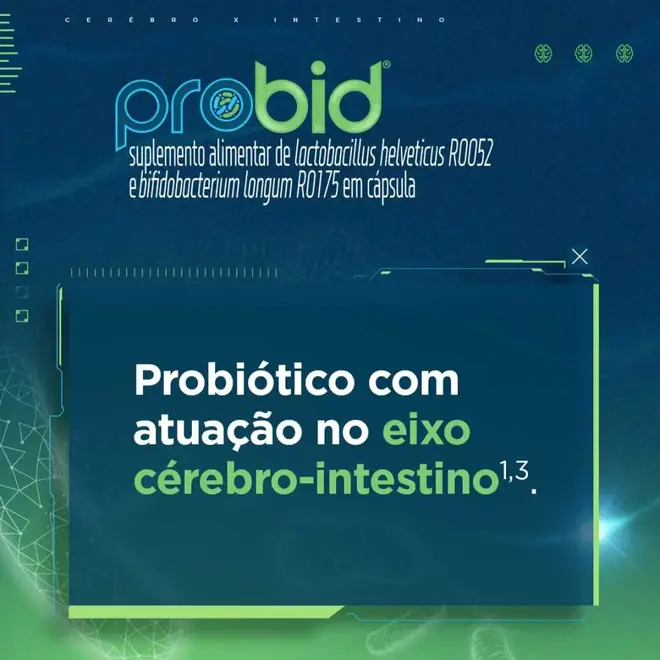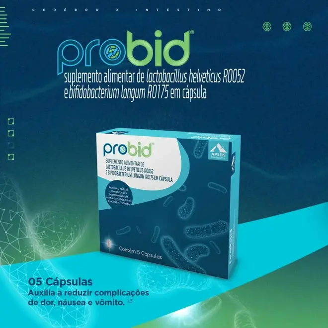 Probid é um suplemento alimentar em cápsulas de Lactobacillus helveticus R0052 e Bifidobacterium longum R0175, indicado para melhorar a saúde gastrointestinal. É o 1º probiótico com alegação funcional aprovada pela Anvisa, para auxiliar na redução dos seguintes sintomas: