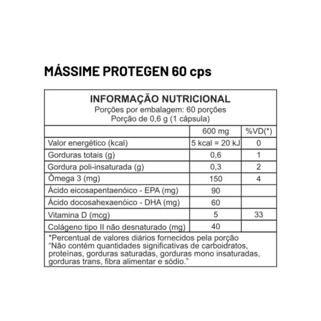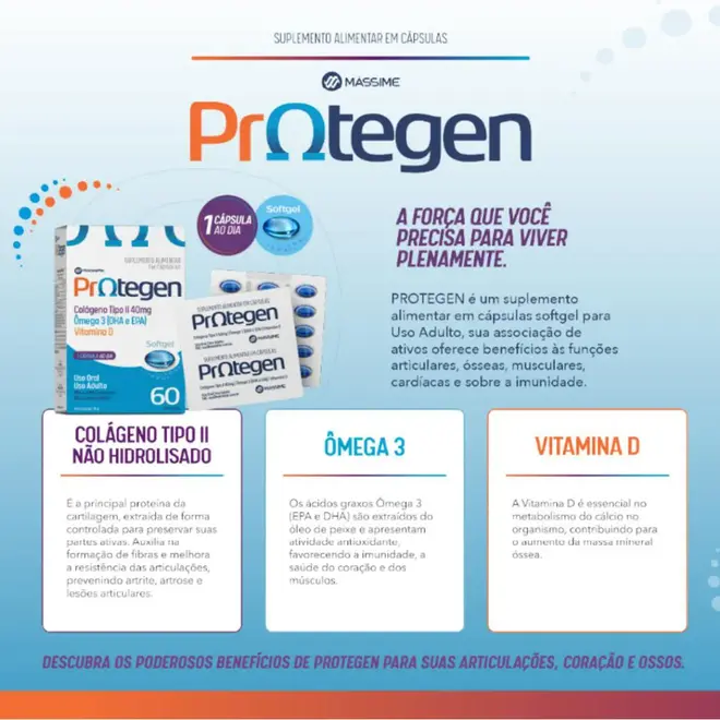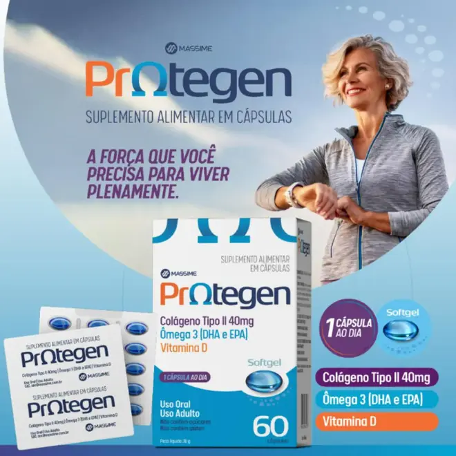 Mássime Protegen é um suplemento alimentar em cápsulas softgel desenvolvido para oferecer suporte completo à saúde articular, óssea, muscular, cardiovascular e imunológica. Sua fórmula avançada combina três ativos cientificamente reconhecidos por seus benefícios à saúde: colágeno Tipo II não hidrolisado, Ômega 3 (EPA e DHA) e vitamina d. Colágeno Tipo II não hidrolisado (40 mg) É a principal proteína presente na cartilagem. Extraída de forma controlada, mantém sua estrutura ativa, contribuindo para a reconstrução da cartilagem, redução de dores articulares, e prevenção de artrite, artrose e outras condições articulares degenerativas. Ômega 3 (150 mg) Composto por EPA (90 mg) e DHA (60 mg), ácidos graxos essenciais com propriedades anti-inflamatórias, que melhoram a circulação sanguínea, auxiliam na saúde cardiovascular, muscular e fortalecem a imunidade. vitamina D (5 mcg - 33% VD) Essencial para a absorção de cálcio, contribui para o fortalecimento dos ossos, músculos e sistema imunológico. Seu consumo diário ajuda a prevenir osteopenia e osteoporose.