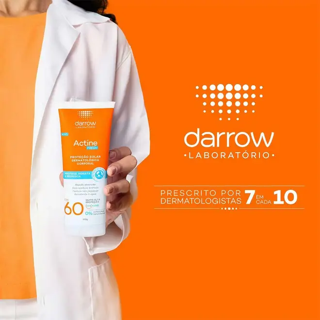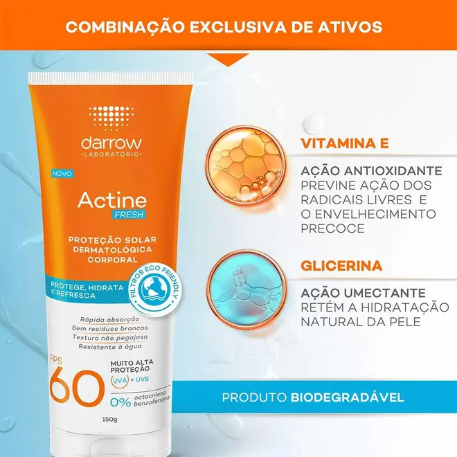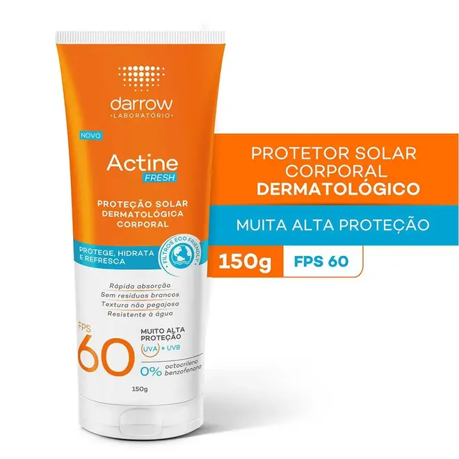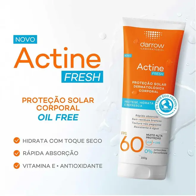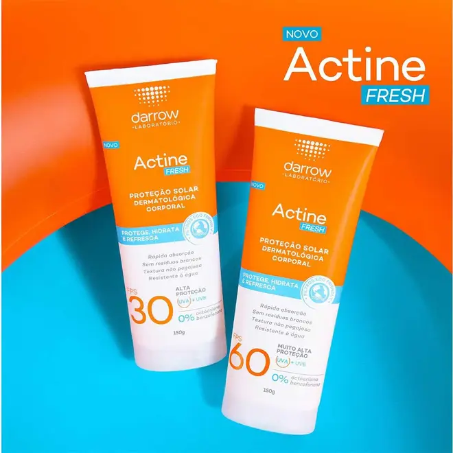 Desenvolvido especialmente para peles brasileiras, o protetor solar Darrow Actine Fresh Solar protege, hidrata e refresca a pele, com alta proteção UVA e UVB com filtros eco-friendly, além de contar com vitamina e para ação antioxidante.