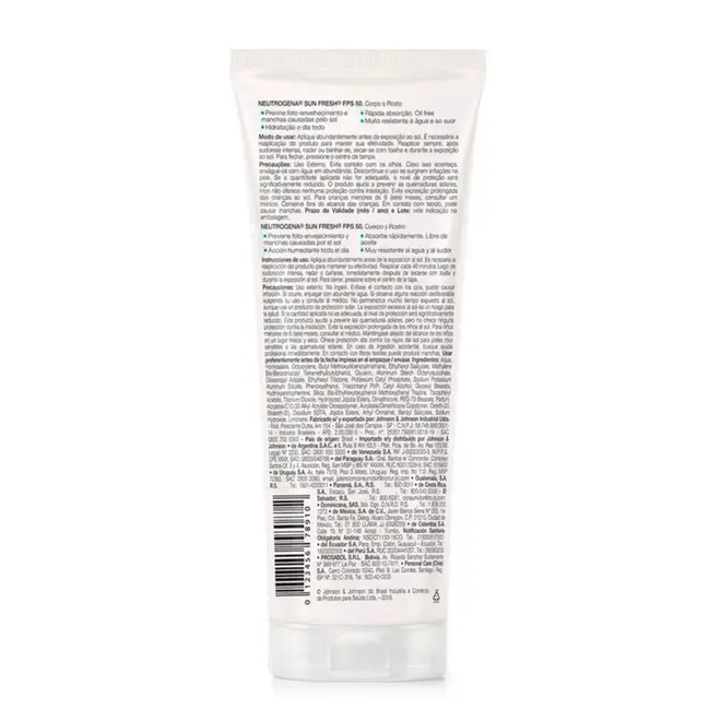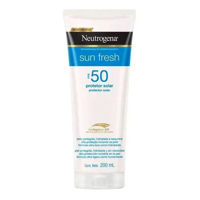 O que é e para que serve? O Protetor Solar Corporal Neutrogena Sun FreshFPS 50, 200ml de textura ultraleve, antioxidante, que deixa a pele hidratada, fresca e sequinha. É de rápida absorção, fácil de aplicar e possui tecnologia HELIOPLEX® que proporciona alta proteção contra os raios UVA e UVB, além de prevenir o envelhecimento e as manchas causadas pelo sol e ser muito resistente à água e ao suor Benefícios e diferenciais Fórmula com textura ainda mais leve Nova tecnologia Helioplex XP Protege contra raios UVA, UVB e luz visível Antioxidante Pele protegida, hidratada e sequinha Invisível na pele Fórmula ultra leve como hidratante Mais agradável de usar Oil Free Resistente à água e ao suor Como usar Aplique abundantemente antes da exposição ao sol. É necessária a reaplicação do produto para manter sua efetividade. Reaplicar sempre, após sudorese intensa, nadar ou banhar-se, secar-se com toalha e durante a exposição ao sol. Para fechar, pressione o centro da tampa. Composição Aqua, Homosalate, Octocrylene, Butyl Methoxydibenzoylmethane, Ethylhexyl Salicylate, Methylene Bis-Benzotriazolyl Tetramethylbutylphenol, Styrene/Acrylates Copolymer, Glycerin, Caprylyl Methicone, Ethylhexyl Triazone, Aluminum Starch Octenylsuccinate, Bis-Ethylhexyloxyphenol Methoxyphenyl Triazine, Silica, Potassium Cetyl Phosphate, Phenoxyethanol, Triacontanyl PVP, Cetyl Alcohol, Glyceryl Stearate, Hydroxyacetophenone, Tocopheryl Acetate, Hydrolyzed Jojoba Esters, Dimethicone, PEG-75 Stearate, Parfum, Acrylates/C10-30 Alkyl Acrylate Crosspolymer, Acrylates/Dimethicone Copolymer, Ceteth-20, Steareth-20, Disodium EDTA, Jojoba Esters, Amyl Cinnamal, Benzyl Salicylate, Limonene Precauções Uso Externo. Evite contato com os olhos. Caso isso aconteça, enxágue-os com água em abundância. Descontinue o uso se surgirem irritações na pele. Se a quantidade aplicada não for adequada, o nível de proteção será significativamente reduzido. O produto ajuda a prevenir as queimaduras solares, mas não oferece nenhuma proteção contra a insolação. Evite exposição prolongada das crianças ao sol. Para crianças menores de 6 (seis) meses, consultar um médico. Conserve fora do alcance das crianças. Em contato com tecido, pode causar manchas.