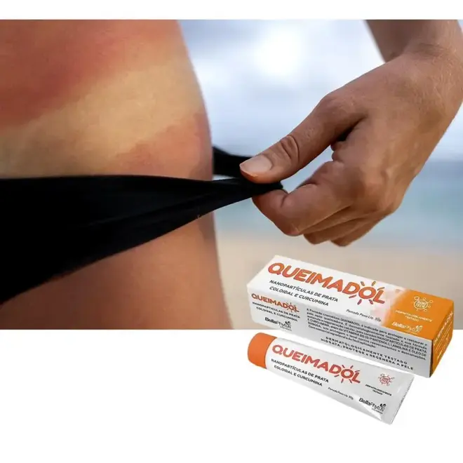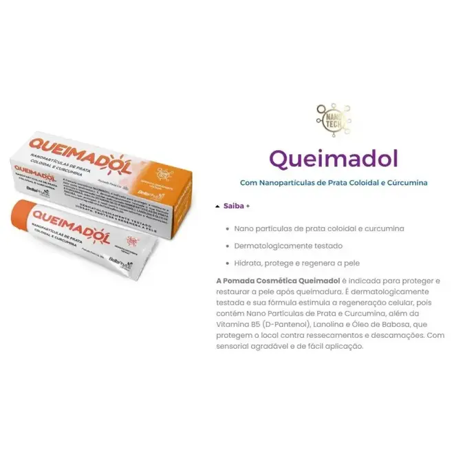A Pomada Queimadol é um produto formulado para proteger e restaurar a pele após queimadura. Sua fórmula estimula a regeneração celular, pois contém Nano Partículas de Prata e Curcumina, além da Vitamina B5 (D-Pantenol), Lanolina e Óleo de Babosa, que protegem o local contra ressecamentos e descamações.