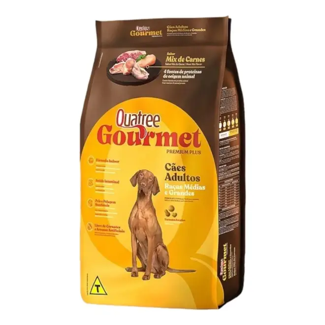 Quatree Gourmet é um alimento Premium Plus com quatro excelentes fontes de proteínas de origem animal e ingredientes especiais para aprimorar a nutrição do seu pet. Superior na sua formulação e incomparável no sabor, Quatree Gourmet proporciona uma vida mais saudável e alegre para o seu cão.