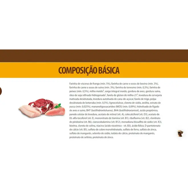 Farinha de vísceras de frango (mín. 5%), farinha de carne e ossos de bovino (mín. 3%), farinha de carne e ossos de suíno (mín. 3%), farinha de torresmo (mín. 0,5%), farinha de peixes (mín. 0,5%), milho moído², sorgo integral moído, gordura de aves, gordura suína, óleo de soja refinado hidrogenado¹, farelo de glúten de milho-21², levedura de cervejaria inativada desidratada, levedura autolisada de cana-de-açúcar, farelo de trigo, polpa desidratada de beterraba (mín. 0,5%), lignocelulose, cloreto de sódio, zeólita, extrato de yucca (mín. 0,025%), mananoligossacarídeo (MOS) (mín. 0,09%), hidrolisado de fígado de aves e suíno, BHT (butilhidroxitolueno), BHA (butilhidroxianisol), ácido propiônico, parede celular de levedura, acetato de retinol (vit. A), colecalciferol (vit. D3), acetato de DL-alfa-tocoferol (vit. E), mononitrato de tiamina (vit. B1), riboflavina (vit. B2), cloridrato de piridoxina (vit. B6), cianocobalamina (vit. B12), menadiona bissulfito de sódio (vit. K3), biotina, cloreto de colina, niacina (ácido nicotínico - vit. B3), ácido fólico, D-pantotenato de cálcio (vit. B5), sulfato de cobre monohidratado, sulfato de ferro, sulfato de zinco, sulfato de manganês, selenito de sódio, iodato de cálcio, proteinato de manganês, proteinato de selênio, proteinato de zinco.