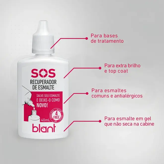 Não altera e não danifica o brilho original do esmalte; Não possui: tolueno, cânfora, DBP e formaldeído; Não contém: álcool, acetato de amila (óleo de banana). Dicas para manter a qualidade do esmalte: Não deixar o frasco aberto por muito tempo e tenha certeza de fechá-lo adequadamente para evitar que os solventes evaporem; Limpar o bocal do frasco com o SOS Recuperador de Esmalte que, quando sujo, impede o fechamento total do mesmo.