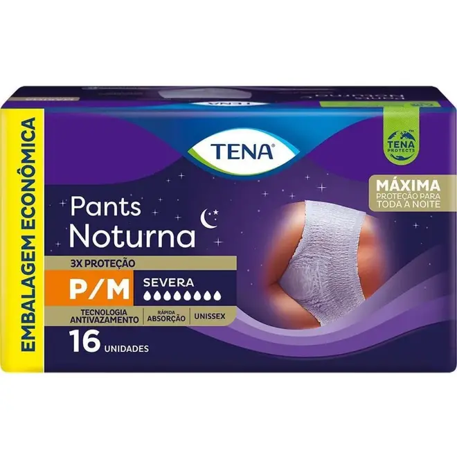 Roupa íntima Tena Pants Noturna P/M 16 Unidades TENA Pants Noturna é uma roupa íntima descartável e unissex de rápida absorção, proporcionando ao usuário máxima proteção durante toda a noite.