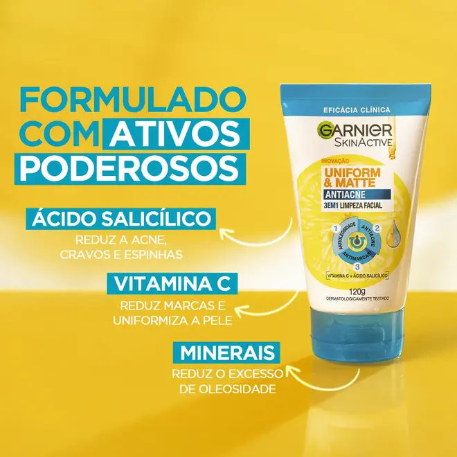 O Sabonete de Limpeza Facial 3 em 1 Antiacne Garnier SkinActive Uniform & Matte 120g é a escolha ideal para quem busca uma pele limpa, uniforme e livre de oleosidade. Com ação multifuncional, ele pode ser utilizado como sabonete facial, esfoliante e máscara, oferecendo um cuidado completo em um único produto.