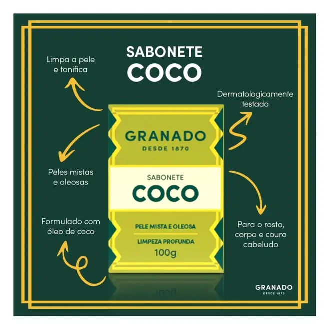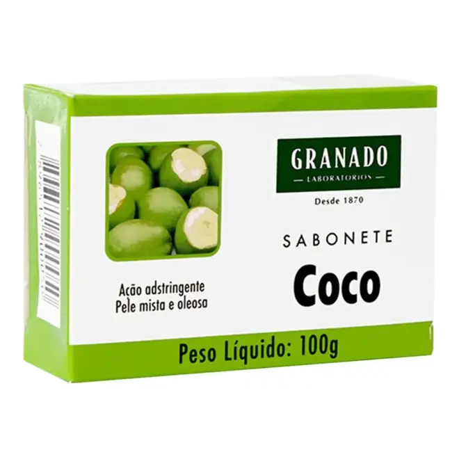 O Sabonete em Barra Granado Coco 100g é formulado com base vegetal e desenvolvido para proporcionar limpeza eficiente da pele, especialmente indicado para peles mistas e oleosas.