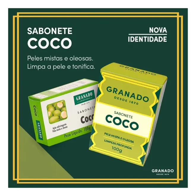 Com fragrância suave de coco e fórmula tradicional da Granado, o produto é ideal para uso diário na higiene do corpo e das mãos.