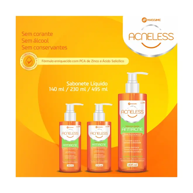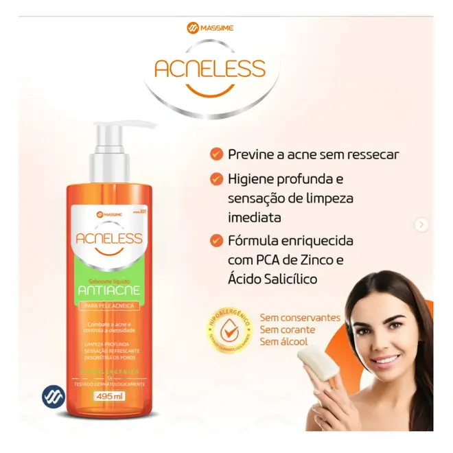 O Acneless Sabonete Líquido Antiacne é desenvolvido especialmente para a limpeza da pele acneica, auxiliando no combate à acne e no controle da oleosidade da pele.