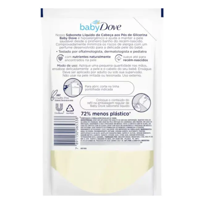 O Sabonete Líquido Baby Dove Hidratação Glicerinada foi desenvolvido para cuidar da pele sensível do bebê desde o primeiro banho. Com uma nova fórmula hipoalergênica, este sabonete é ideal para a limpeza da cabeça aos pés, proporcionando uma hidratação glicerinada que mantém a pele macia e protegida.