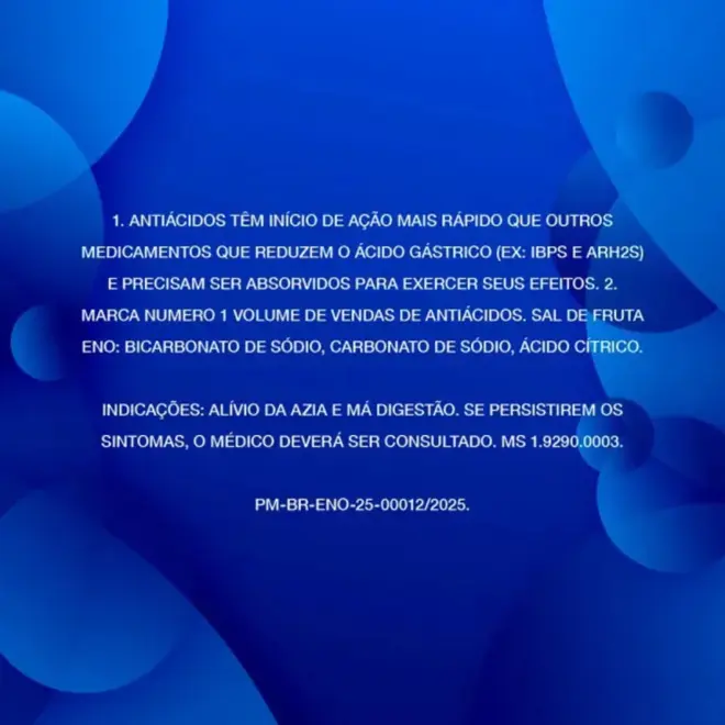 O Sal de Fruta Eno Sabor Limão é indicado para o alívio rápido da azia, má digestão e desconfortos estomacais causados pelo excesso de acidez, proporcionando bem-estar em poucos minutos.