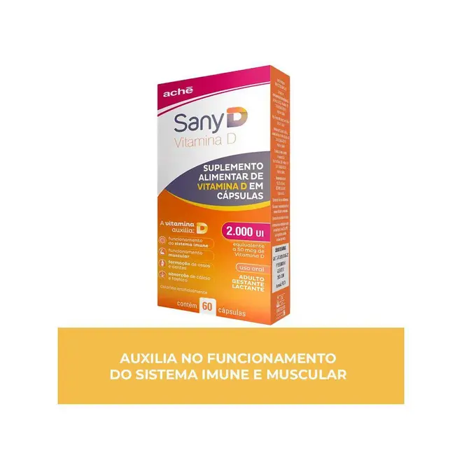 Sany D Caps (colecalciferol) é um medicamento a base de vitamina D3 (colecalciferol), indicado para prevenção e tratamento auxiliar na desmineralização óssea (perda dos minerais do osso), do raquitismo (depósito deficiente de cálcio nos ossos durante o crescimento), osteomalácia (alteração do depósito de minerais nos ossos que pode ocorrer no adulto e idoso) e prevenção no risco de quedas e fraturas.