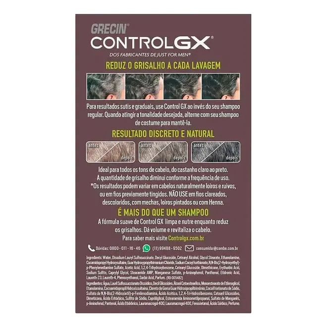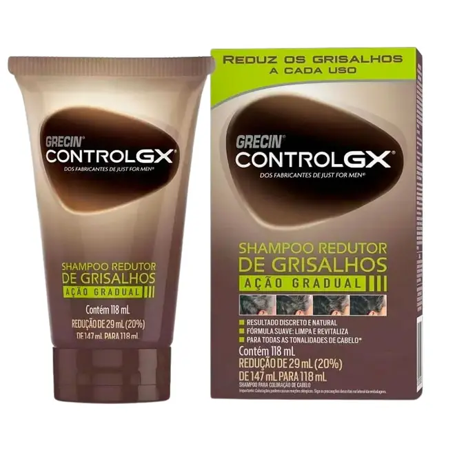O Shampoo Redutor De Grisalhos Grecin Control Gx 118ml é o primeiro e único shampoo inteligente o bastante para reduzir gradualmente e permanentemente os cabelos brancos ou grisalhos de forma lenta e gradual, enquanto ele limpa e condiciona seu cabelo. Você obtém um visual extremamente natural e sutil. Basta usá-lo no lugar do seu shampoo habitual até que você alcance o resultado esperado. Em seguida, use-o em rotação com o seu shampoo habitual para manter o aspecto que você gosta. Nunca houve uma maneira mais fácil de controlar o seu cabelo grisalho ou branco.
