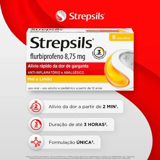 Strepsils pastilhas é indicado para a inflamação da garganta, proporcionando alívio sintomático por até 3 horas.