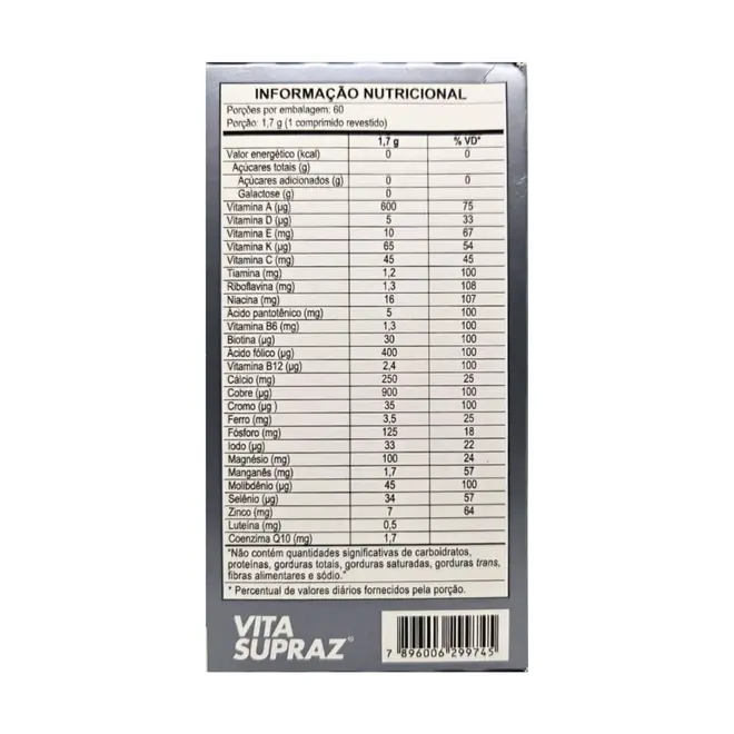 Sua fórmula contém 24 vitaminas e minerais, incluindo vitaminas A, C, D, E, complexo B, ferro, cobre, luteína e coenzima Q10, nutrientes que contribuem para o fortalecimento do sistema imunológico, manutenção da energia e suporte à saúde geral.