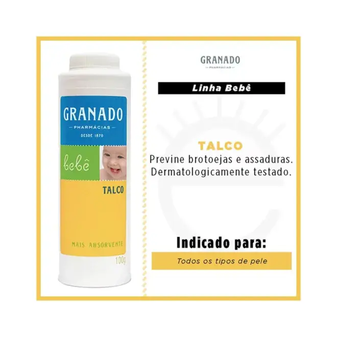 O Talco Infantil Granado Bebê 100g foi desenvolvido especialmente para o cuidado delicado da pele do bebê. Sua fórmula suave ajuda a absorver a umidade da pele, mantendo-a seca, protegida e confortável ao longo do dia.