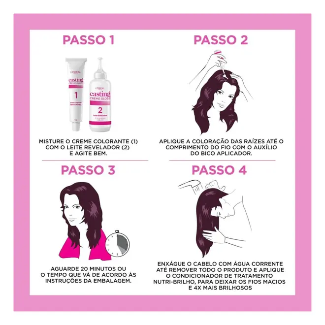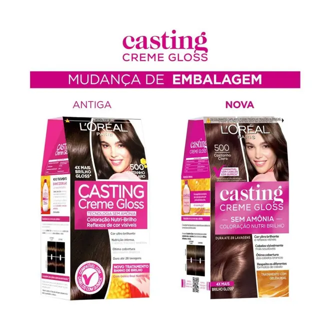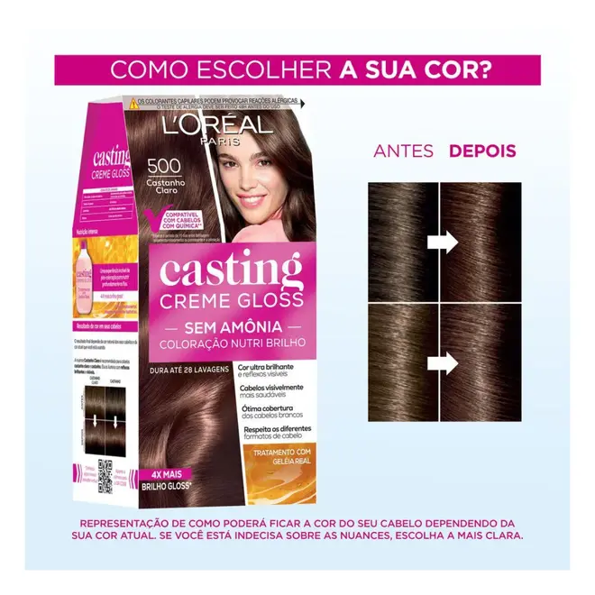 Casting Creme Gloss de L'Oréal Paris é a coloração sem amônia que oferece aos cabelos uma cor ultra brilhante e reflexos visíveis. Sua fórmula exclusiva respeita os diferentes formatos de cabelo, proporcionando nutrição intensa e fios visivelmente mais saudáveis durante o processo de coloração.