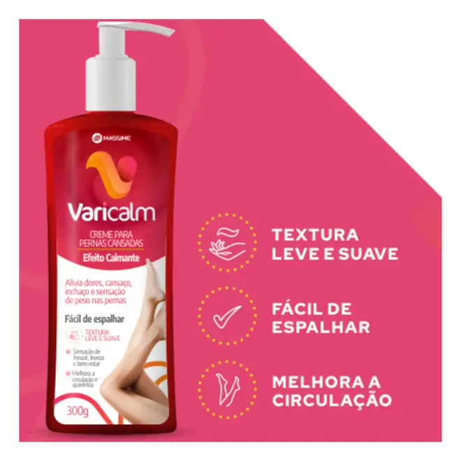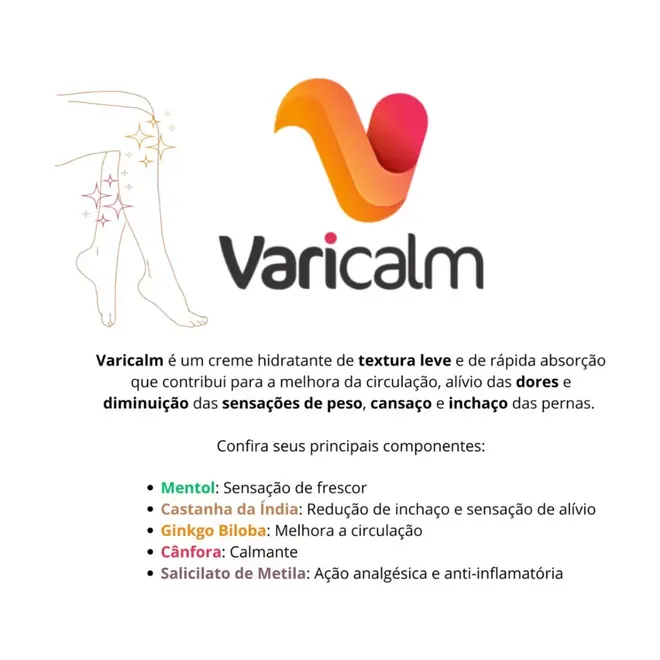 O Varicalm Creme para Pernas Cansadas é um creme corporal desenvolvido para proporcionar sensação de alívio e conforto em pernas cansadas, auxiliando na redução da sensação de peso, cansaço e inchaço nas pernas.
