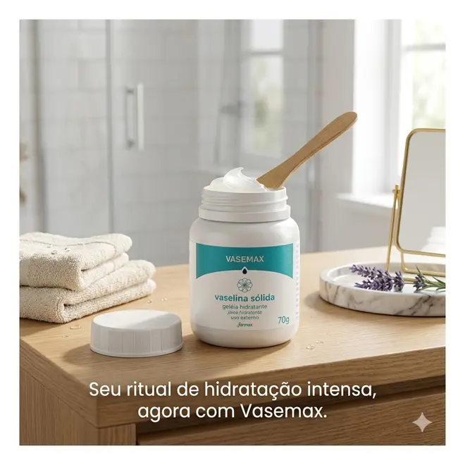 A Vaselina Sólida Vasemax é uma geleia hidratante indicada para proteção e hidratação da pele, auxiliando na prevenção do ressecamento e no cuidado de áreas sensíveis.