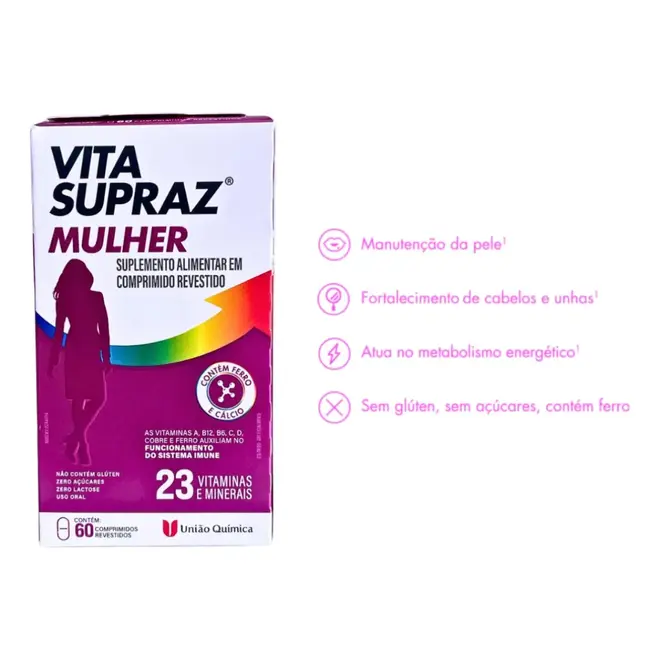 Vita SuprAZ Mulher é um suplemento vitamínico mineral desenvolvido especialmente para atender as necessidades nutricionais específicas das mulheres. Sua fórmula é balanceada e completa, com 23 vitaminas e minerais, incluindo Vitaminas A, B6, C, Biotina e Selênio.