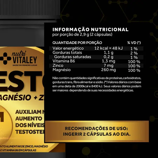 Vitaley Nutri Testo B6 + Magnésio + Zinco 60 Cápsulas Gelatinosas de 1450 mg - Suplemento para Aumento de Testosterona
