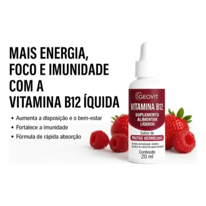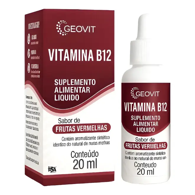 A vitamina B12 Sabor Frutas Vermelhas da Geovit é um suplemento alimentar líquido formulado para auxiliar no funcionamento do sistema imunológico, no metabolismo energético e na formação das células vermelhas do sangue. Com sabor agradável de frutas vermelhas, é uma opção prática para repor esse nutriente essencial.