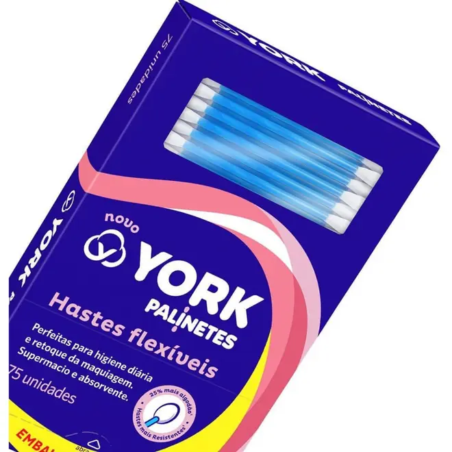 As hastes flexíveis York, em embalagem com 75 unidades, são acessórios de higiene pessoal produzidos com hastes de polipropileno flexível e pontas de 100% algodão hidrófilo.